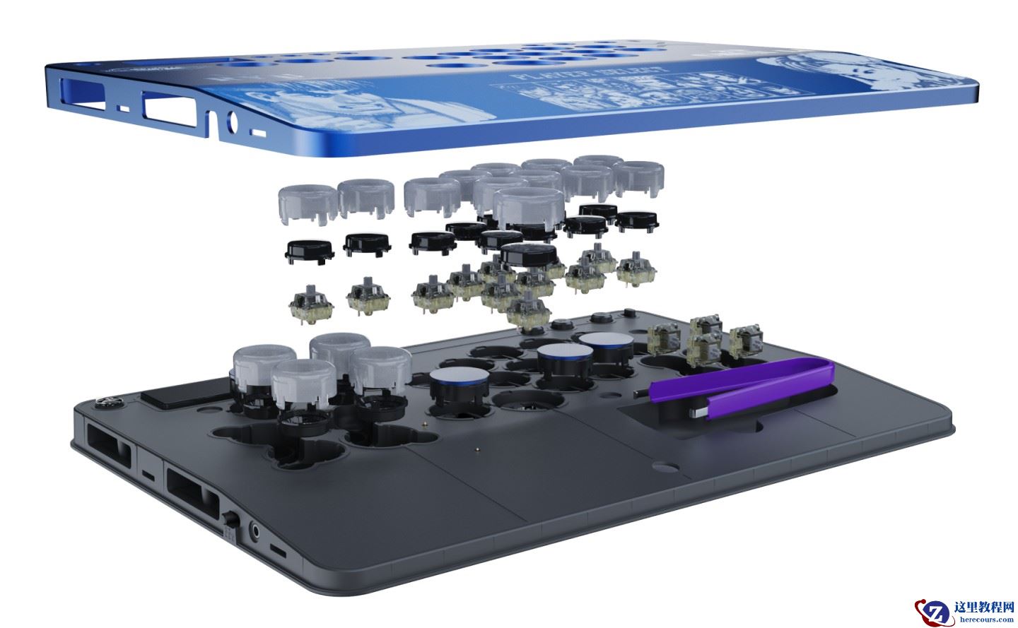 Victrix Pro KO Leverless Fight Stick 搭载 CHERRY 樱桃的快银轴,支持轴体热插拔,标准模式下拥有 12 个按键,可更换面盖下方则放置有另外 4 个按键的开关和键帽以及拔键器。