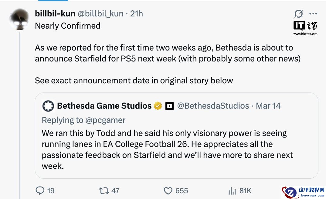 3 月 15 日消息,B 社在 X 平台发文确认下周将有新消息与玩家分享,消息源 billbil-kun 随后转发了该动态,并透露 B 社届时预计将公布 PS5 版《星空》。