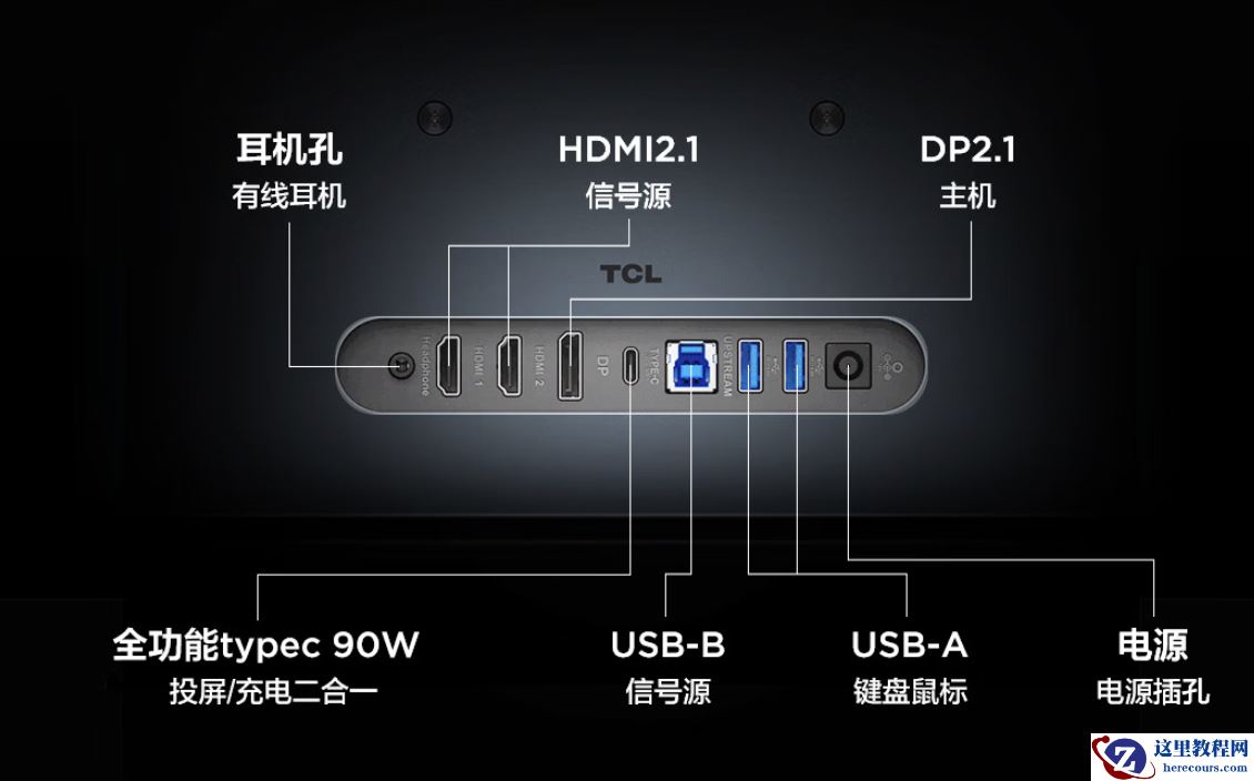 其他方面,该机内置环境光传感器,显示器背面提供 RGB 氛围灯,配有 B&O 深度定制音响。提供 2 个 HDMI 2.1、1 个 USB-C 90W、1 个 DP2.1、2 个 USB-A(KVM)接口。