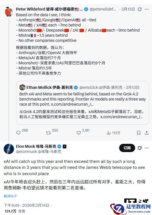 注意到,这条发布于 3 月 14 日的帖子,是对预测师彼得 · 威尔德福德评估的直接回复。该评估基于各类基准测试和公开报道,对人工智能开发商进行了排名。