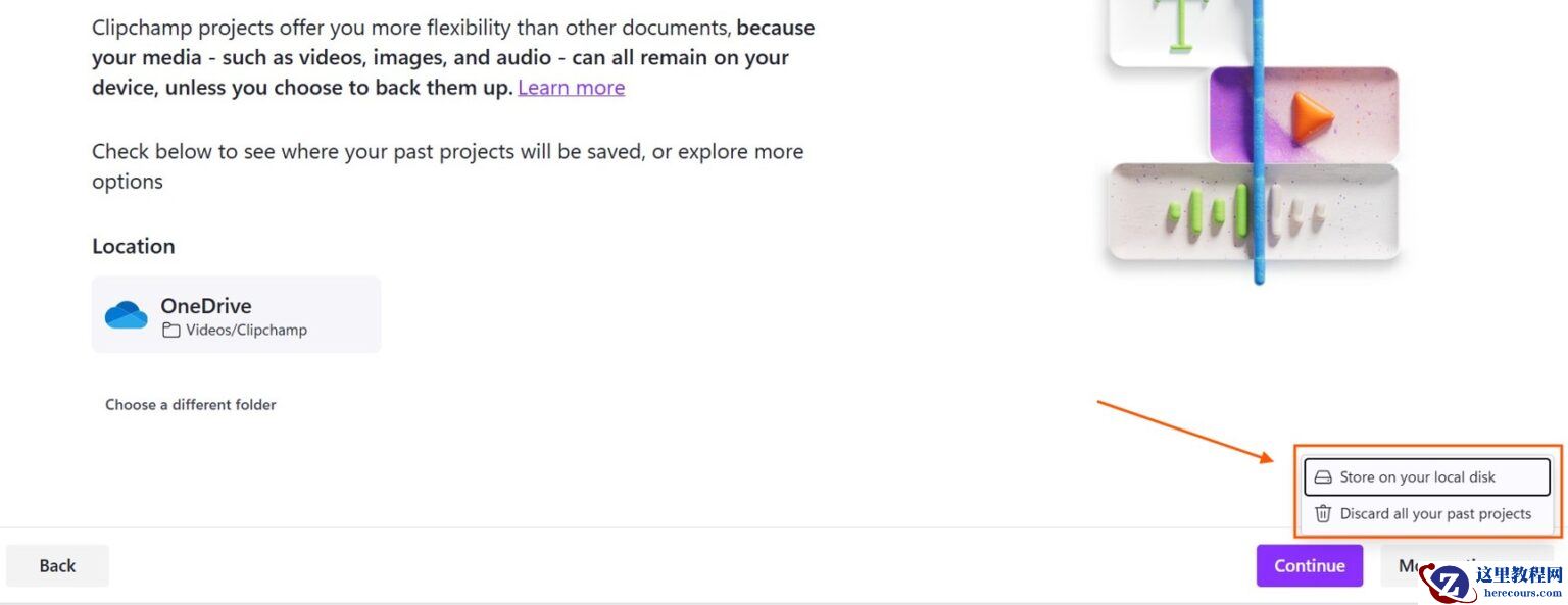 对于那些不想将项目迁移到 OneDrive 的用户,微软还提供了“更多选项”,允许用户将现有项目“存档”到本地磁盘,或者彻底删除所有过往项目。选择“存储到本地磁盘”会将现有项目从 Clipchamp 中移除,并提示用户选择一个文件夹来归档这些项目。