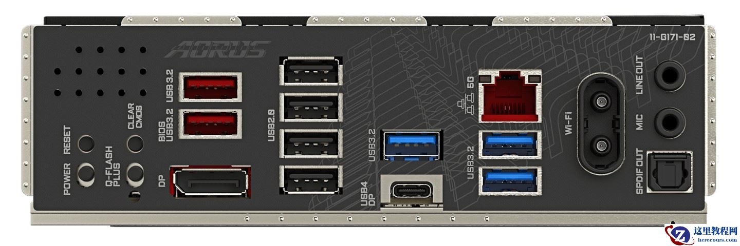后部接口:1× DisplayPort、1× USB-C 40Gbps、2× USB-A 10Gbps、3× USB-A 5Gbps、4× USB-A 480Mbps、1× 5GbE RJ45、一对 Wi-Fi 天线插孔、1× S/PDIF-out、2× 音频插孔。