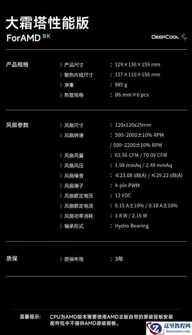 该风扇仅配备适用于 AMD 的 AM5/AM4 平台扣具,风扇整体尺寸为 129x136x159mm,延续 6mm 六热管设计,使用镀镍铜底。
