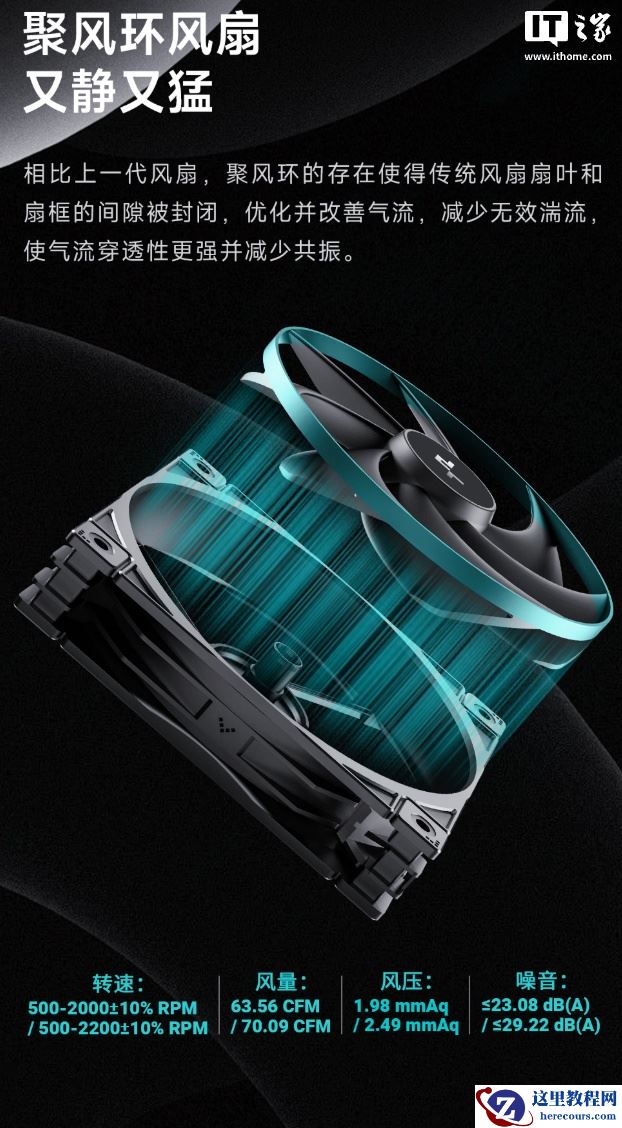 其配备 120mm AGB 液压轴承 PC 材质风扇,转速范围设定在 500~2000±10%/500~2200±10% RPM,风量静压上分别可以达到 62.16/68.85 CFM 和 1.75/2.10 mmH2O,最大噪音值不超过 28.10/30.93 分贝。