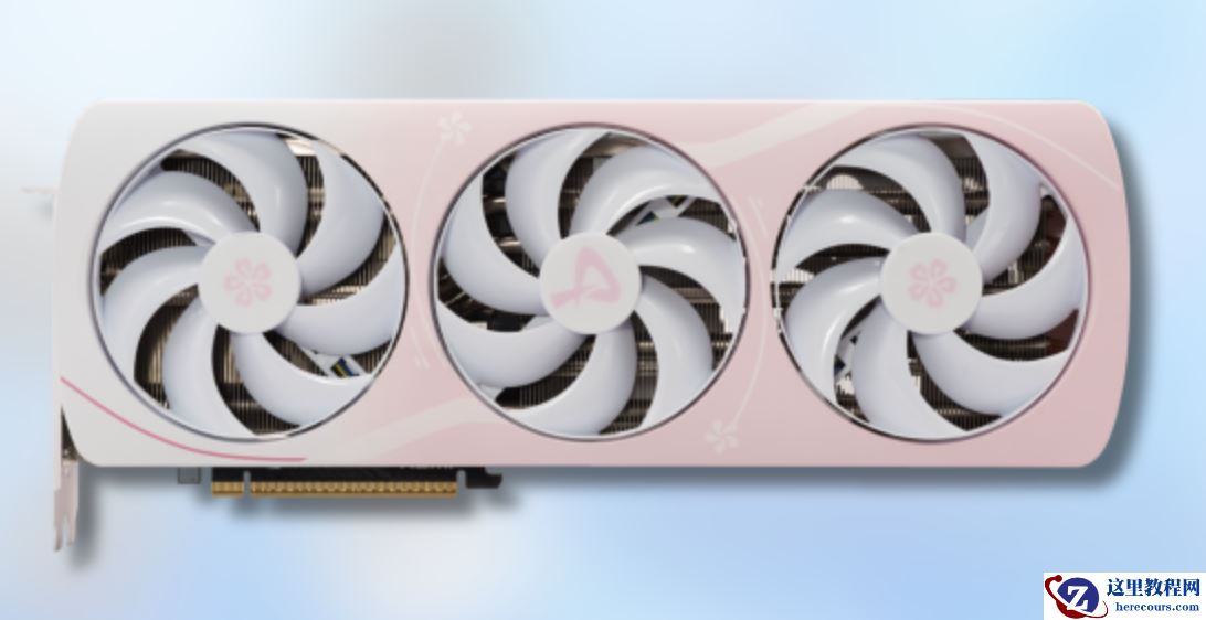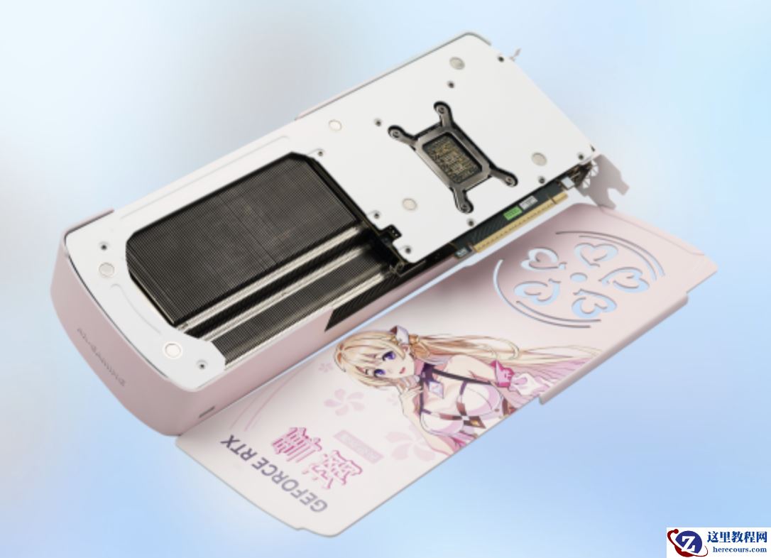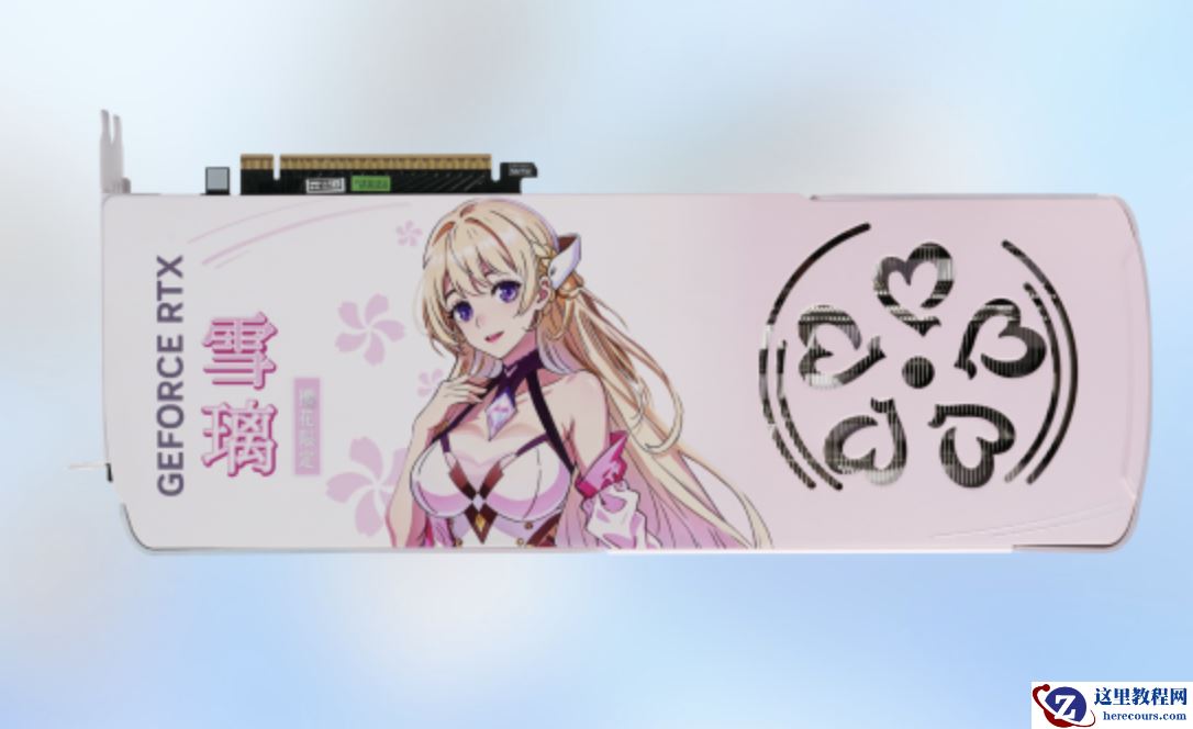 该显卡采用对称式方案,使用白粉渐变外壳,边角造型柔和。三枚散热风扇除了中间带有 AX 标志外,左右两把的扇心处均印有专属樱花纹样。显卡侧面印有 GEFORCE RTX 标识,同时带有青蓝及粉色樱花纹理。显卡背板印有雪璃 IP 形象。