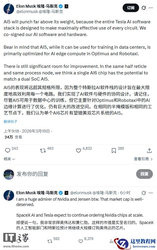 3 月 19 日消息,埃隆 · 马斯克今日在 X 平台发文称,“如果运气好,再借助人工智能加速,我们或许能在 12 月完成 AI6 的流片。”