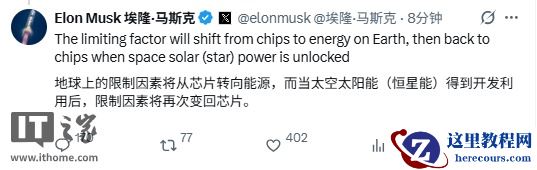 马斯克还称,“(人工智能在)地球上的限制因素将从芯片转向能源,而当太空太阳能(恒星能)得到开发利用后,限制因素将再次变回芯片。”