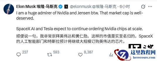 在回复自己的这条贴文时,马斯克称:“顺便说一句,我非常崇拜英伟达和黄仁勋。这样的市值是实至名归的。SpaceX 的人工智能部门和特斯拉预计将继续大规模订购英伟达的芯片。”