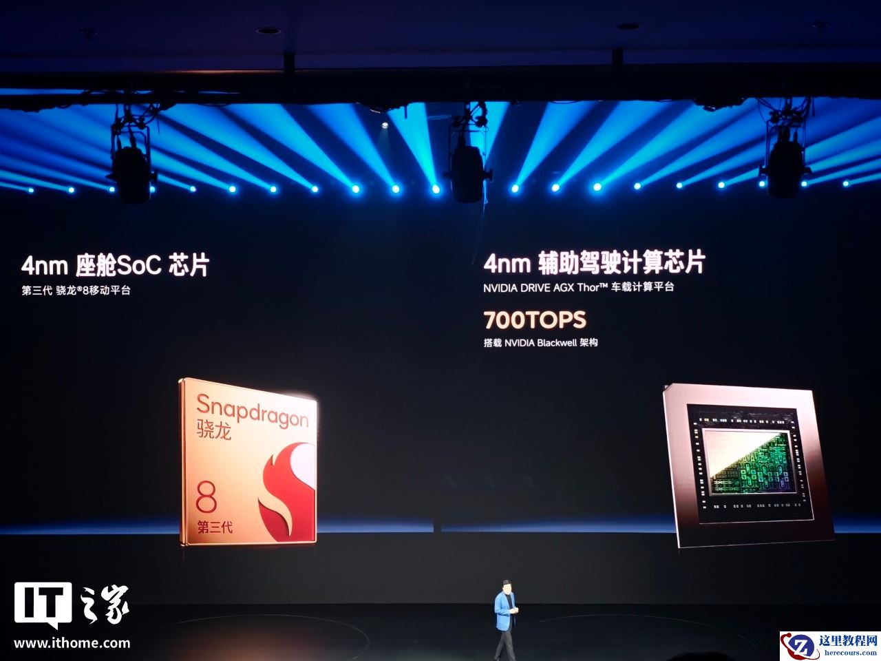 从发布会现场获悉,新一代 SU7 搭载旗舰级芯片(第三代骁龙 8 移动平台 + 700TOPS 算力 4nm 辅助驾驶计算芯片),核心板通过车规级测试。