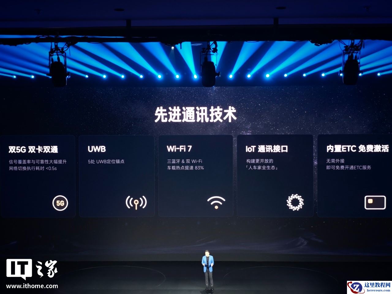 据介绍,新一代 SU7 还带来了更先进的通讯技术,包括双 5G 双卡双通、UWB 近场控车、Wi-Fi 7 上车、IoT 通讯接口、内置 ETC(免费激活)等。