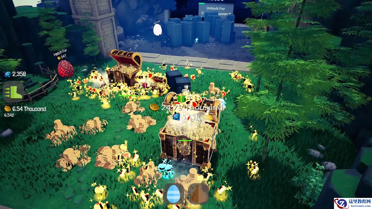 游戏整体玩法较为轻松,属于典型的点击 + 放置机制。玩家只需在关卡中不断点击宝箱等地图物件,即可快速获取金币,随后可用来孵化各类宠物。这些宠物会自动帮助玩家进行采矿,并推动解锁后续区域。