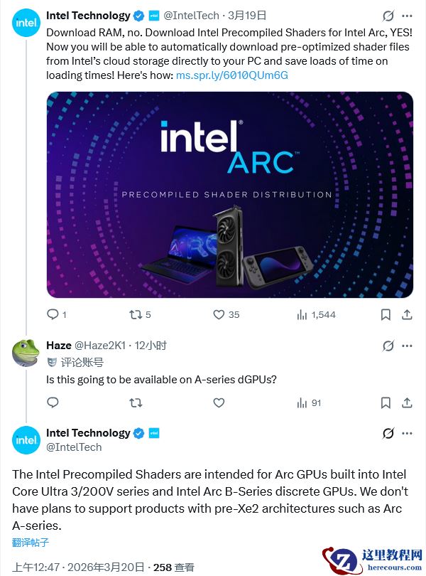 3 月 20 日消息,英特尔北京时间今日向网友确认,32.0.101.8626 版本显卡驱动程序中推出的图形着色器分发服务仅限 Xe2 及更新架构的 GPU,不计划将其推广到 Xe1 乃至更早的显卡上。