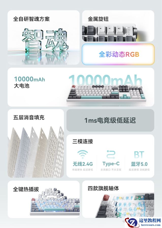 系列键盘提供 1KHz 回报率,其中动力金轴版本内置 5000 毫安时电池,而奶牛轴、轻音轴、极地狐轴内置 10000 毫安时电池。