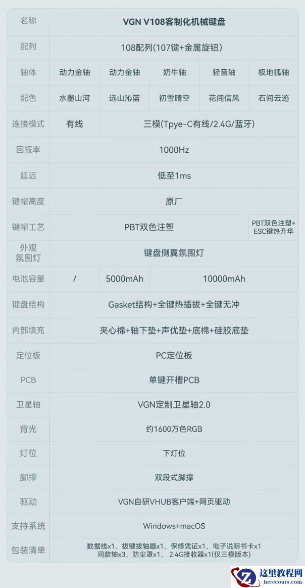 3 月 20 日消息,VGN 现已在京东上架 V108 机械键盘,其可选多种配色及轴体,整理价格信息如下: