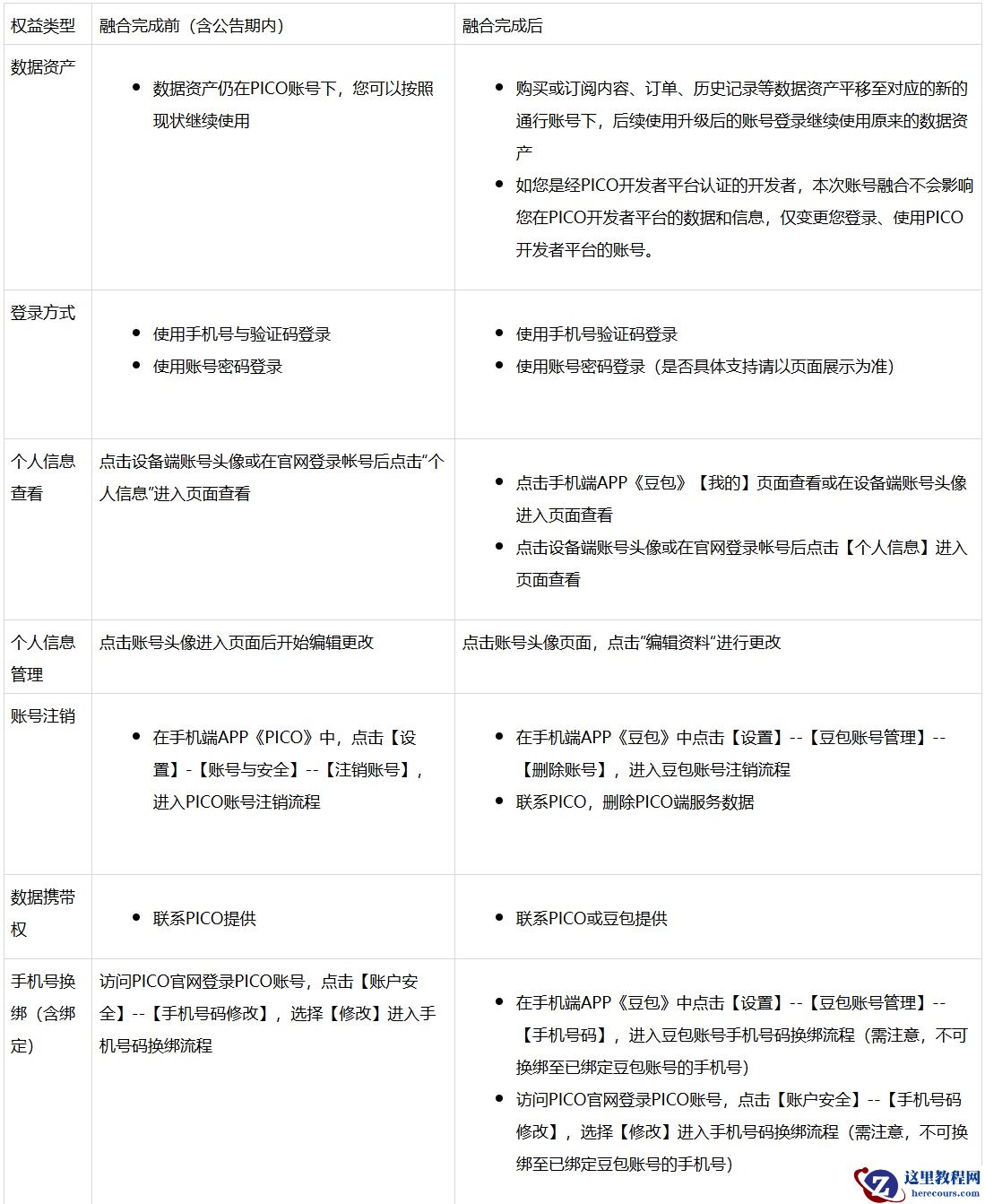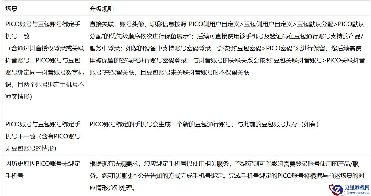 根据 PICO 公告,账号升级将以手机号码作为统一账号服务的数字标识,升级完成后用户可使用该手机号登录所有支持豆包账号的产品及服务,目前包括豆包各版本产品及服务(含豆包 App、PC 端、网页端、插件端及合作移动智能终端上的豆包助手)以及 PICO。升级涉及的数据范围包括昵称、头像、手机号码、邮箱、账号数字标识等账号基础信息。