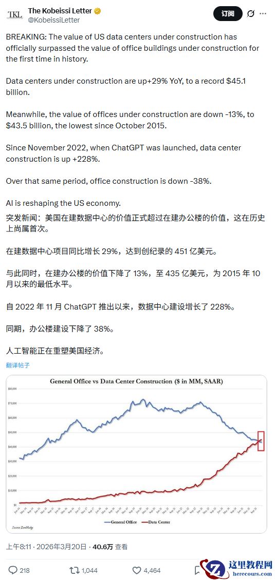 3 月 21 日消息,全球资本市场评论刊物 Kobeissi Letter 昨日发现,2025 年 12 月美国数据中心建设支出首次超越传统办公楼项目,标志着 AI 基础设施投资浪潮正在重塑美国建筑业格局。
