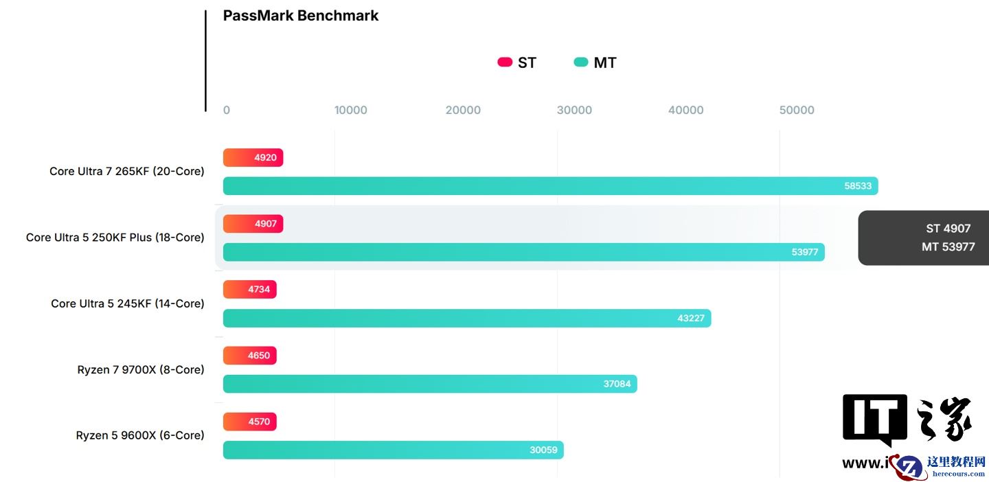 3 月 21 日消息,科技媒体 Wccftech 昨日(3 月 20 日)发布博文,在 PassMark 平台挖掘发现英特尔酷睿 Ultra 5 250KF Plus 处理器踪迹,单核成绩 4907 分,多核成绩为 53977 分。