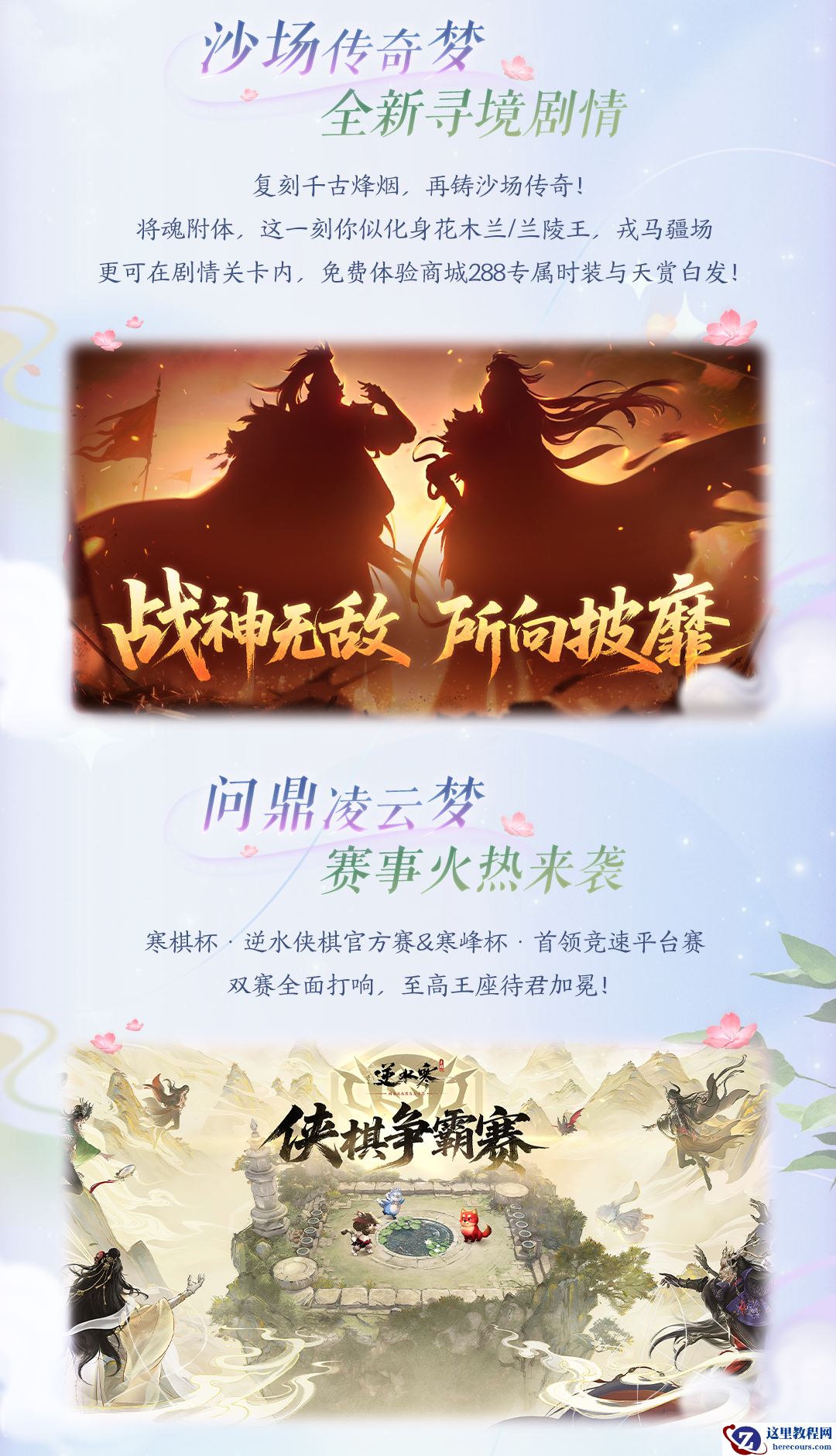 新版本中,寒棋杯 · 逆水侠棋官方赛 & 寒峰杯 · 首领竞速平台赛双赛全面打响,以及多项福利内容、外观配饰等。附官方介绍图如下: