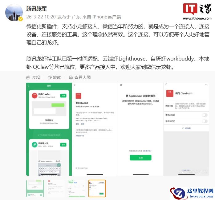 注意到,腾讯公司公关总监张军今日发文回应了“微信新增 ClawBot 插件”。他表示,微信当年所努力的,就是成为一个连接人、连接设备、连接服务的工具。这个理念依然有效。这个连接,可以方便每个人更好地管理自己的龙虾。