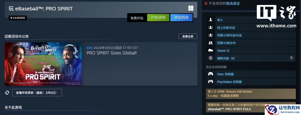 3 月 22 日消息,科乐美 3 月 5 日推出了一款棒球游戏《eBaseball:PRO SPIRIT》。该作目前已收获 75% 的好评率,获“多半好评”。