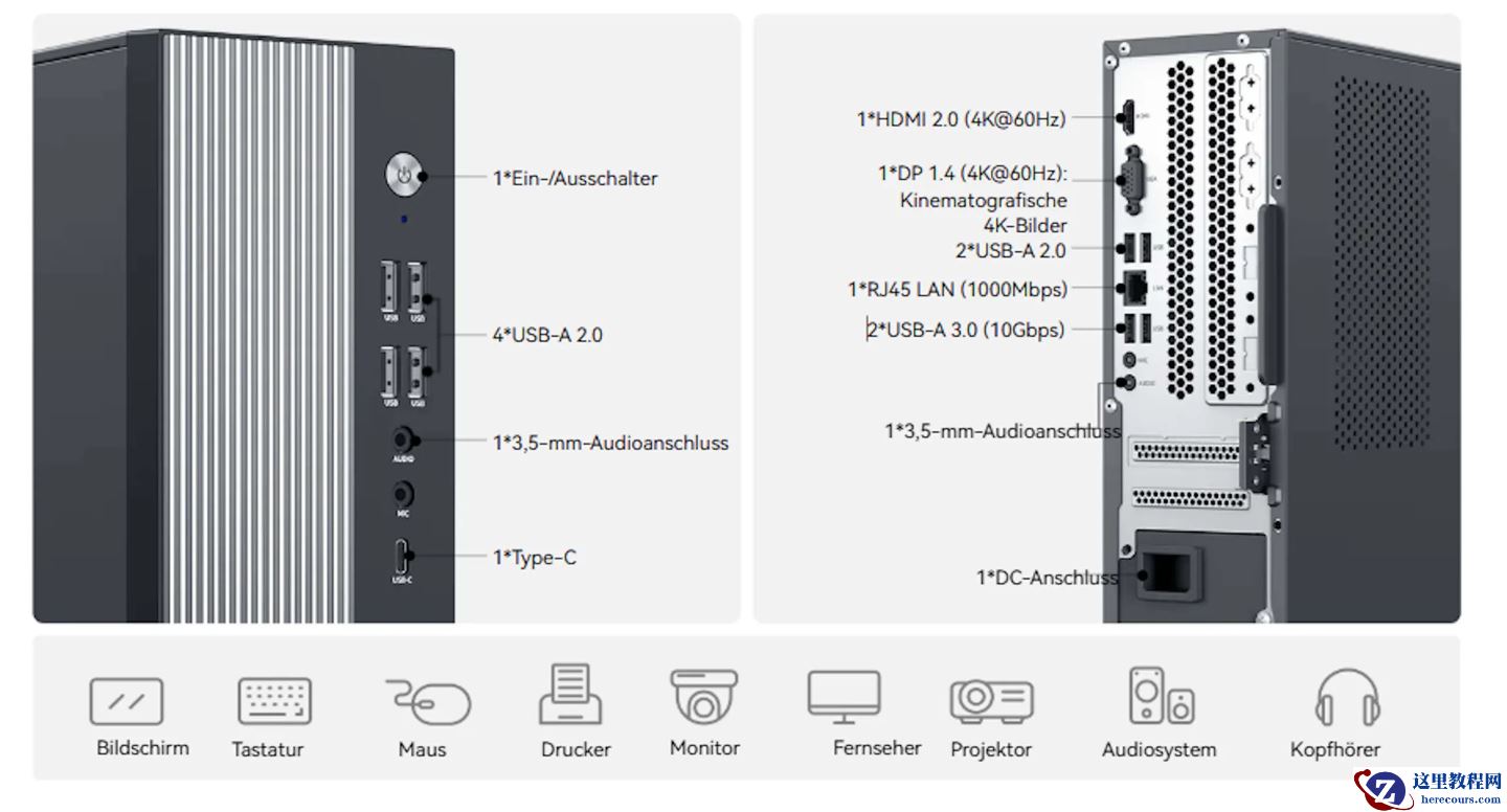 规格方面,这款电脑最多可连接两台 4K 显示器,提供 HDMI 2.0、DisplayPort 1.4 接口,前面板带有 4 个 USB Type-A 2.0+1 个 USB Type-C 接口,后面则是 2 个 USB Type-A 2.0 、2 个 USB Type-A 3.0,还带有千兆以太网口。