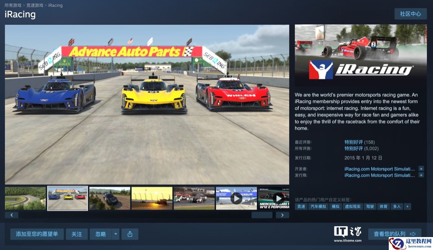 注意到,iRacing 是一款订阅制游戏,在 Steam 平台好评率 84%“特别好评”,游戏在国区每月订阅价格为 56 元、半年订阅优惠价格为 252 元、1 年订阅优惠价为 408 元,游戏商品页(https://store.steampowered.com/app/266410/iRacing/)。