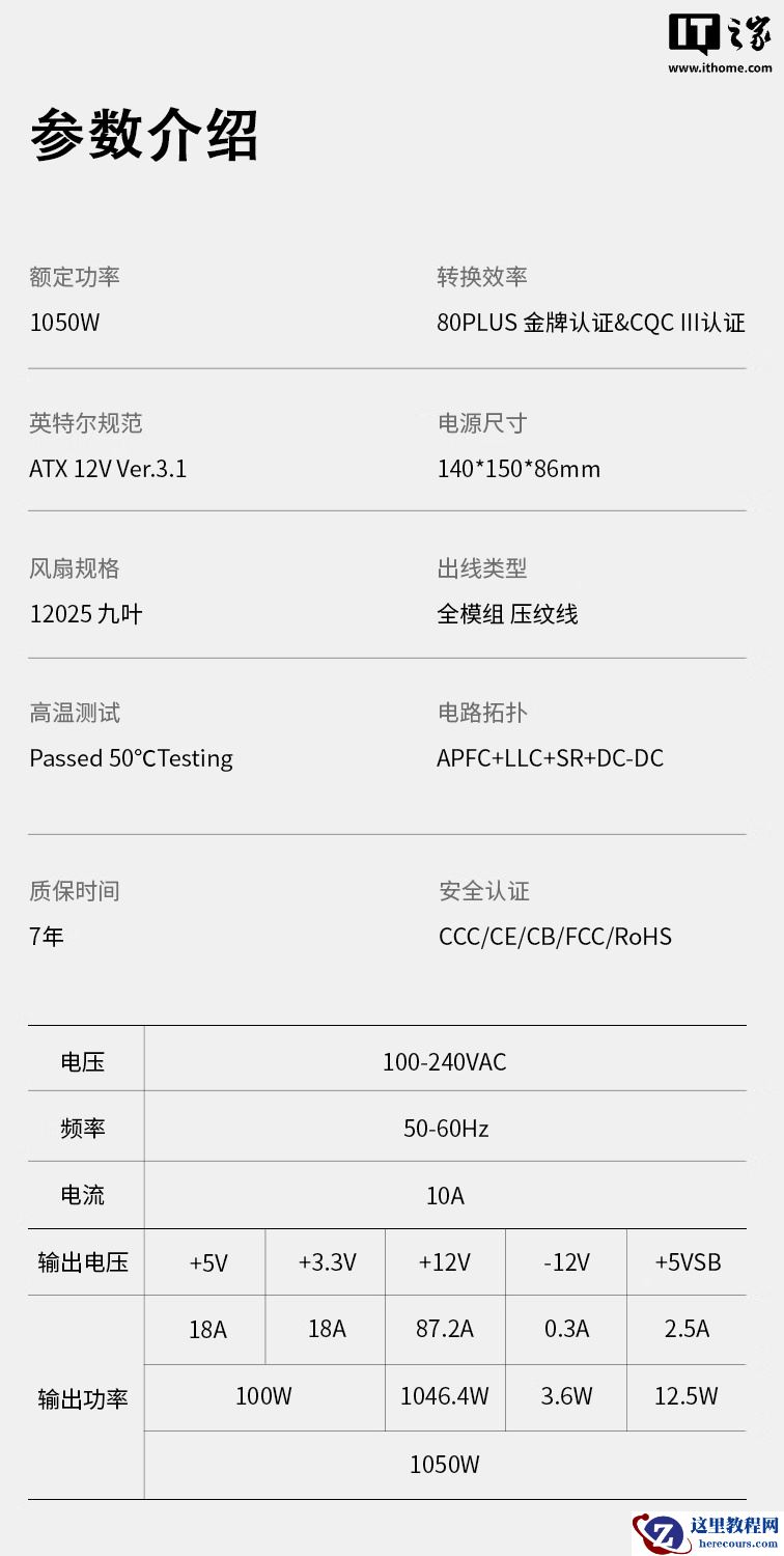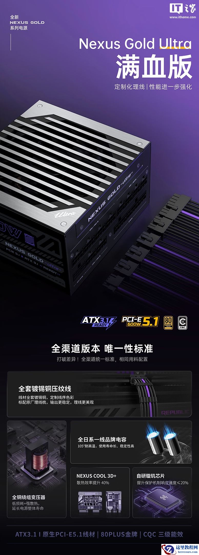 系列电源采用富有科技感的风扇格栅设计,带有原生 12V-2x6 接口,附带黑紫撞色镀锡铜压纹线。电源符合英特尔 ATX 3.1 规范,采用 APFC + LLC + DC-DC 架构,采用全日系电容及自研“璇玑”芯片,匹配 120mm FDB 轴承 9 叶风扇。提供 7 年质保。