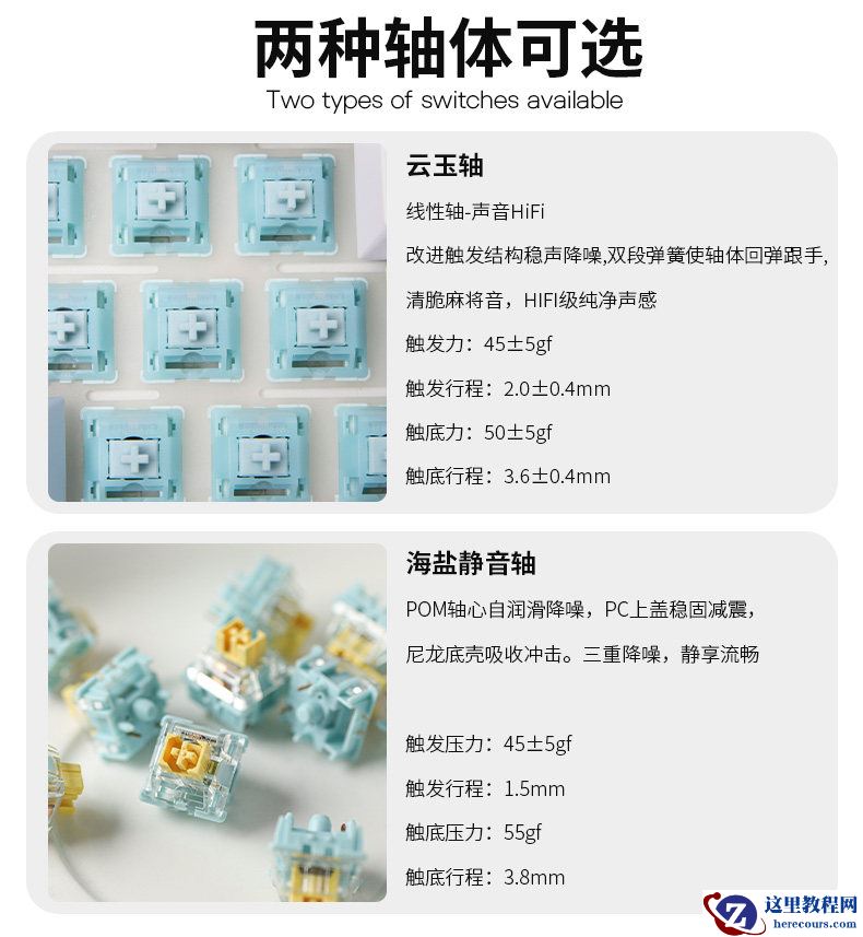 轴体方面,TH80 V2 系列可选云玉轴 (Creamy Jade Switch)、海盐静音轴 (Sea Salt Silent V2 Switch),均为线性手感。配套键帽为原厂高度。