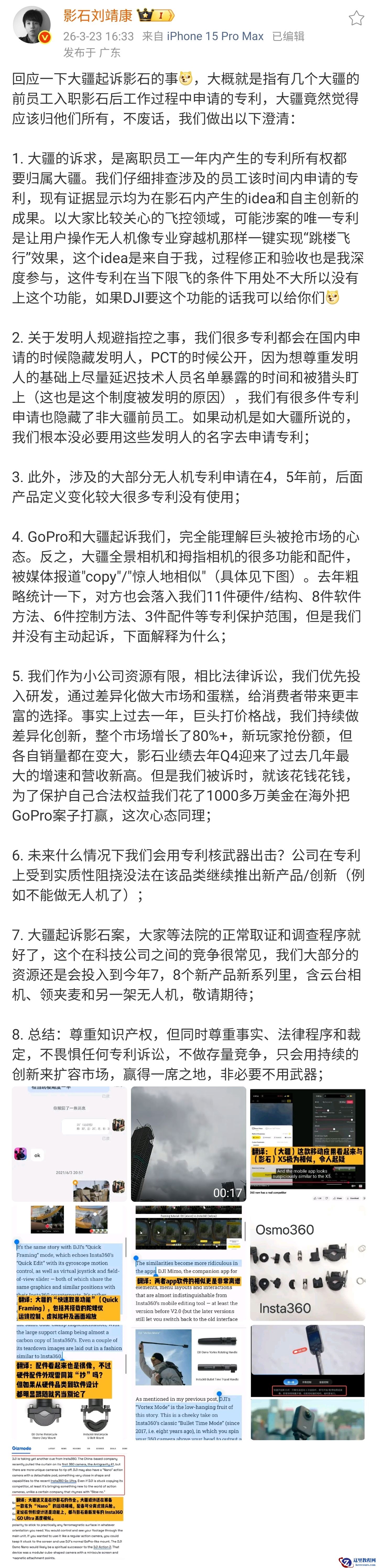 3 月 23 日消息,针对大疆起诉影石创新事件,影石创新 CEO 刘靖康今日发文进行了回应。