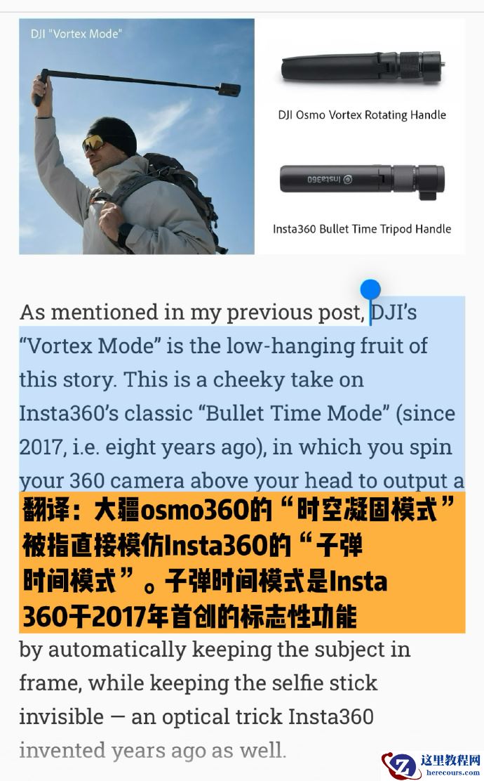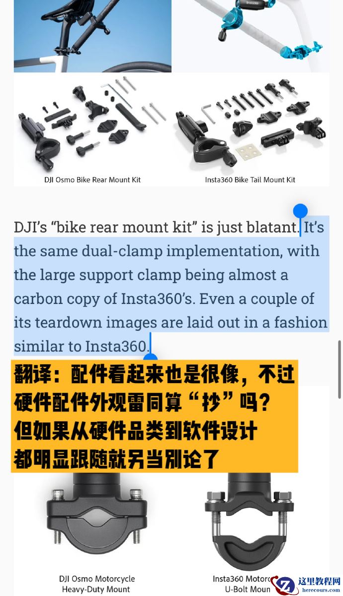 4. GoPro 和大疆起诉我们,完全能理解巨头被抢市场的心态。反之,大疆全景相机和拇指相机的很多功能和配件,被媒体报道“copy”/“惊人地相似”(具体见下图)。去年粗略统计一下,对方也会落入我们 11 件硬件 / 结构、8 件软件方法、6 件控制方法、3 件配件等专利保护范围,但是我们并没有主动起诉,下面解释为什么;