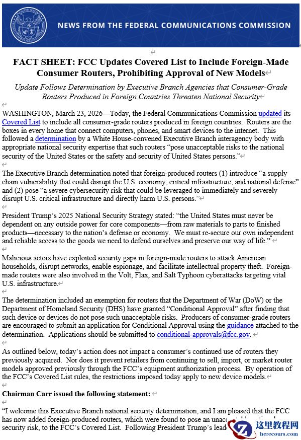 3 月 24 日消息,当地时间周一,美国联邦通信委员会(FCC)以安全担忧为由,宣布将禁止进口所有新款外国制造的消费级路由器。