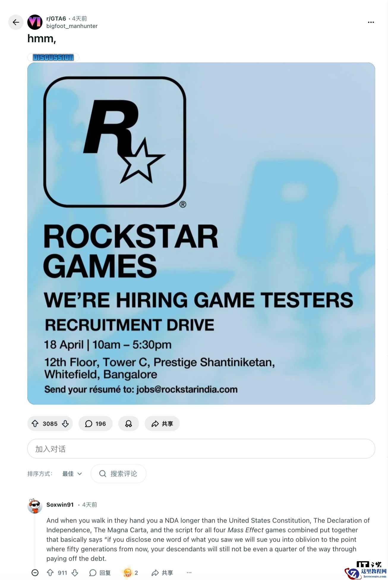 参考 Reddit 贴文,有人跃跃欲试,恨不得马上投简历;也有人站出来“劝退”:“作为一个测试员,我可以告诉你,上报 Bug 是件极其痛苦的事。你得精确记录触发条件、复现步骤,把数据整理得明明白白。如果你是想享受游戏,千万别来。”还有人开玩笑说:“想象一下,为了测试《GTA6》专门去办个工作签证。”