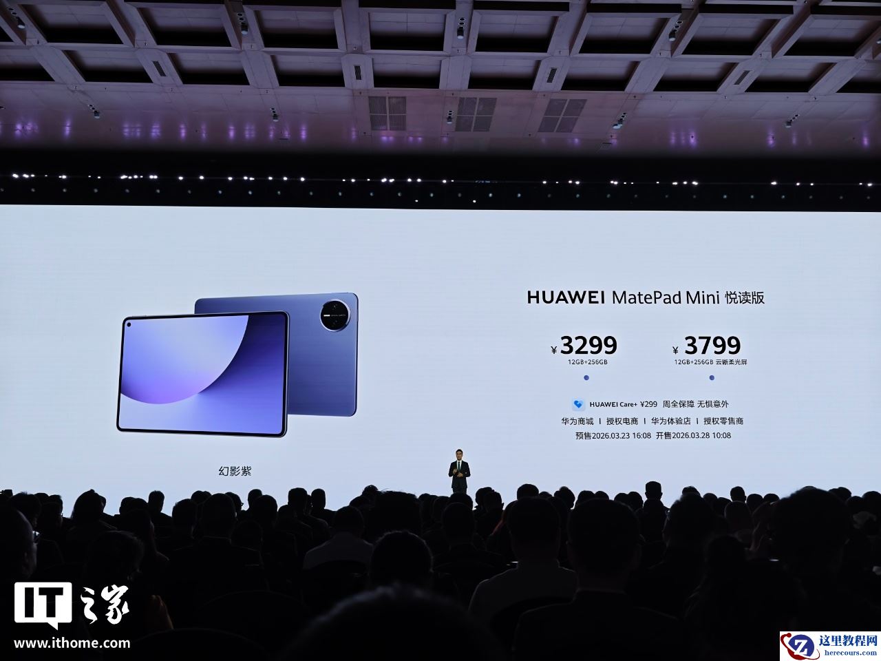 在 3 月 23 日的华为春季全场景新品发布会上,MatePad Mini 小平板悦读版「幻影紫」配色发布,新机预装 HarmonyOS 6 系统、搭载 8.8 英寸 OLED 云晰柔光屏,支持 AI 眼动翻页功能,售价 3299 元起。>> 查看详情