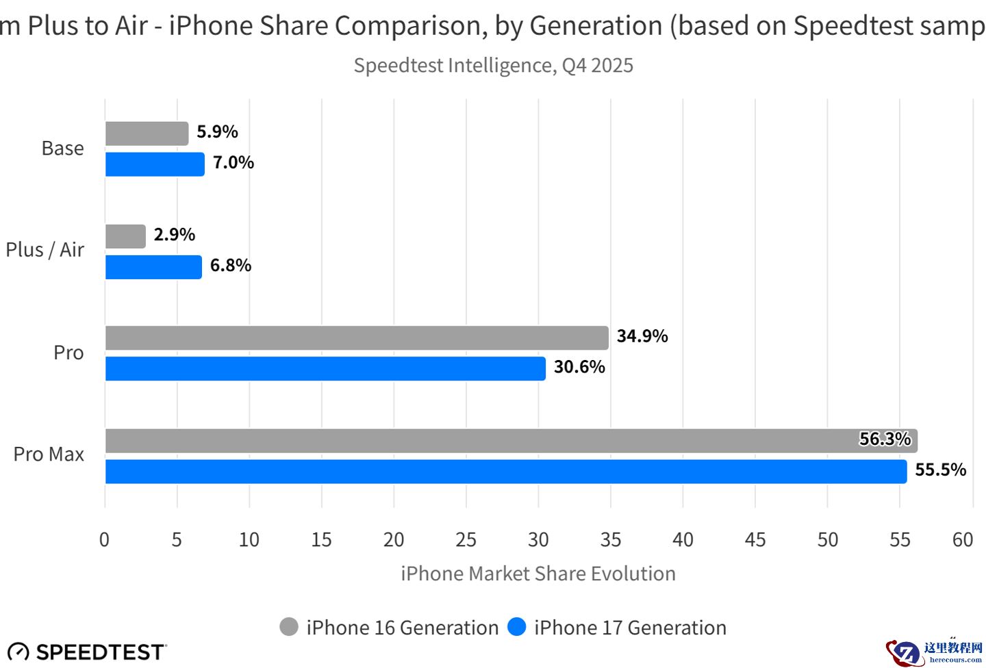 尽管下载与延迟表现优异,但数据同时也暴露出苹果的短板。搭载高通 X80 的 iPhone 17 Pro Max 在上传速度上依然保持最高达 32% 的领先优势。
