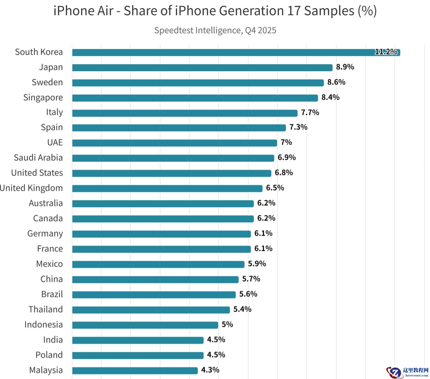 3 月 24 日消息,Ookla 于 3 月 22 日发布博文,报告 2025 年第 4 季度全球测速报告,指出苹果 iPhone Air 搭载的自研 C1X 基带芯片已跻身行业第一梯队。