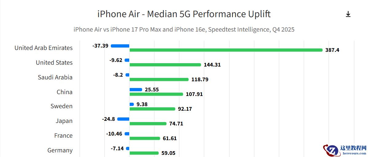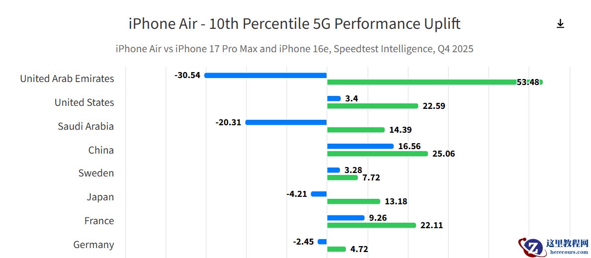 除了下载速度,C1X 在网络延迟方面的表现尤为亮眼。在分析的 22 个全球市场中,iPhone Air 在 19 个市场的延迟指标上击败了 iPhone 17 Pro Max。