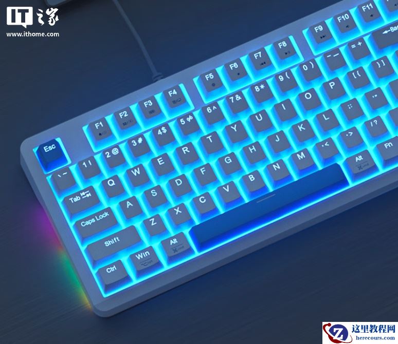 该键盘尺寸为 445.6 x 139 x 43.4mm,采用船壳结构,侧面带有 RGB 灯带。键盘采用 104 键 + 音量旋钮布局设计,使用海盐芝士配色透光键帽,匹配静音红轴,触发压力约 32GF、触底压力约 44GF、总行程约 3.5mm。