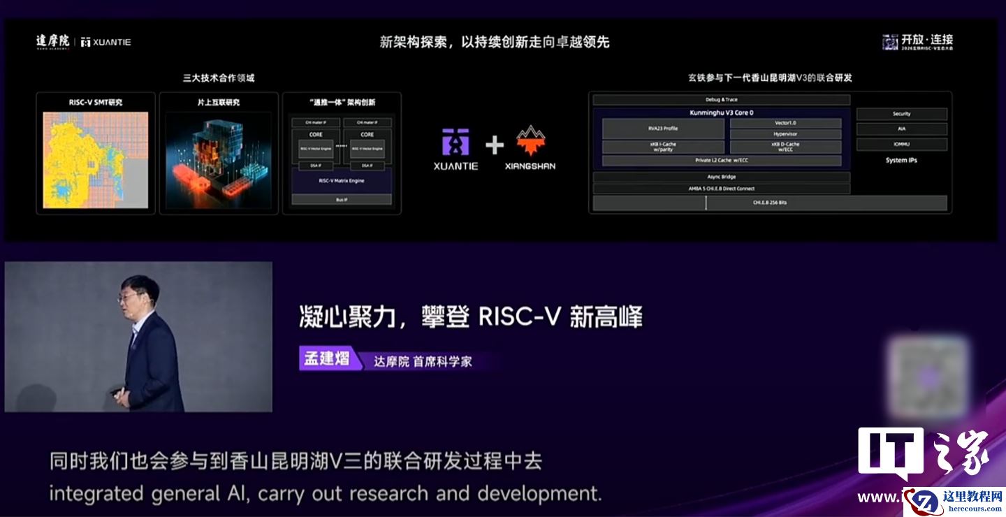 从大会现场获悉,阿里巴巴达摩院首席科学家孟建熠(yì)宣布,玄铁与香山两大 RISC-V 架构达成合作,玄铁也将参与到下一代香山昆明湖 V3 处理器的联合研发。