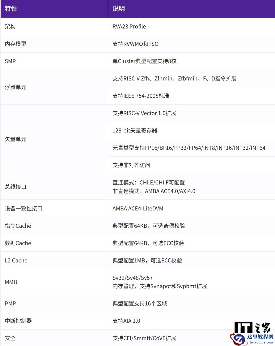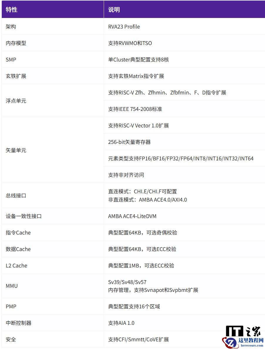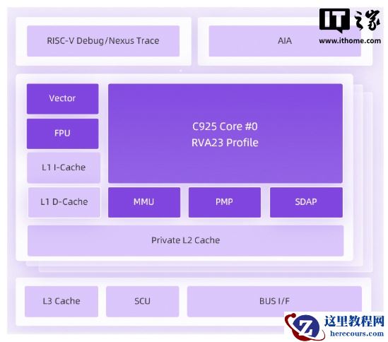 玄铁 C925 同样是一款 64 位多核处理器,采用超标量、乱序执行、4 译码宽度微架构;兼容 RISC-V RVA23 Profile,同时支持 Vector Crypto、Zacas、Zama16b、Smmtt、CoVE、RAS、AIA 以及 Zalasr 等其他扩展。