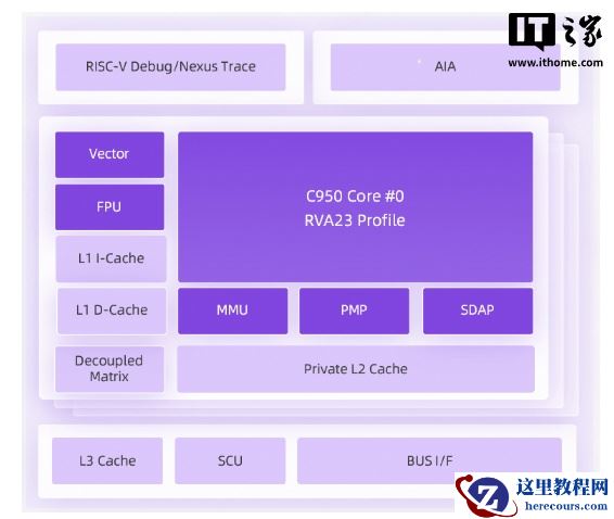 具体来看,玄铁 C950 是一款 64 位多核处理器,采用超标量、乱序执行、8 译码宽度、16 级流水线微架构;兼容 RISC-V RVA23 Profile,同时支持 Vector Crypto、Zacas、Zama16b、Smmtt、CoVE、RAS、AIA 以及 Zalasr 等其他扩展。
