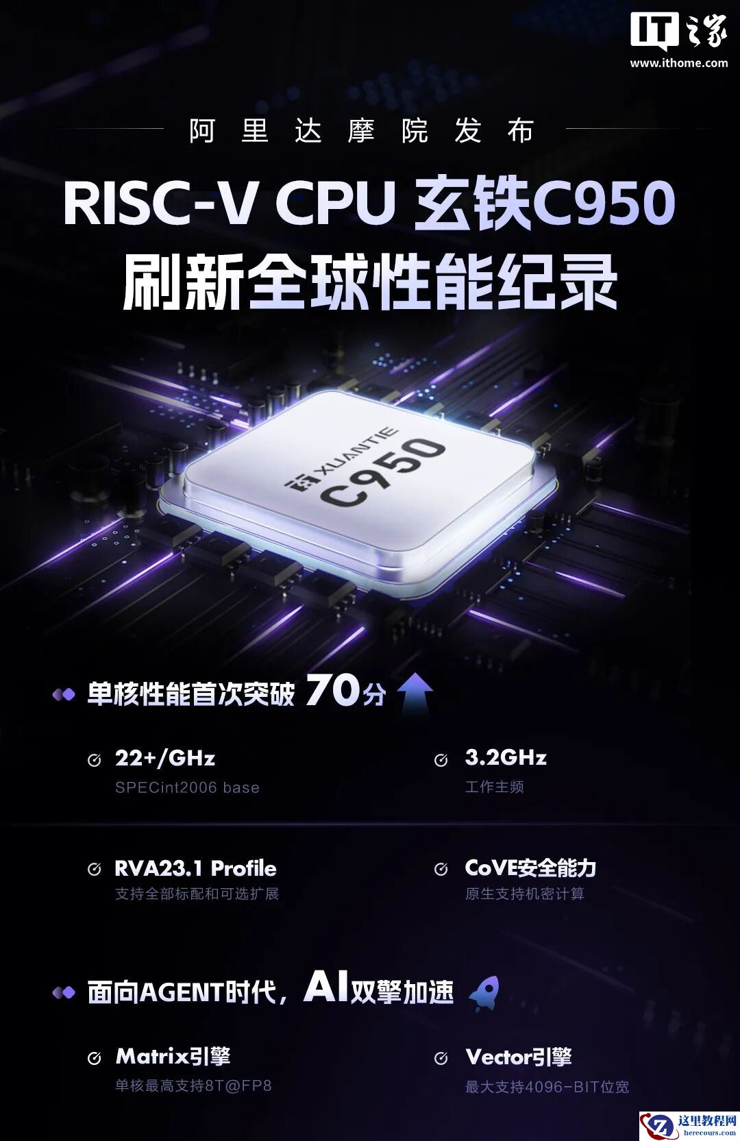 3 月 24 日消息,在今日的 2026 玄铁 RISC-V 生态大会上,阿里达摩院发布了全球性能最高的 RISC-V CPU —— 新一代旗舰处理器玄铁 C950。