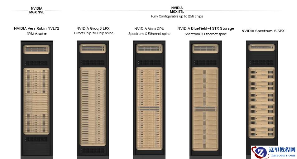 注意到,英伟达的 Vera Rubin POD 包含五款全新的专用机架级扩展系统,均采用第三代 MGX 机架设计,其中 Vera Rubin NVL72 基于 MGX NVL 机架,另外四款基于 MGX ETL 机架。