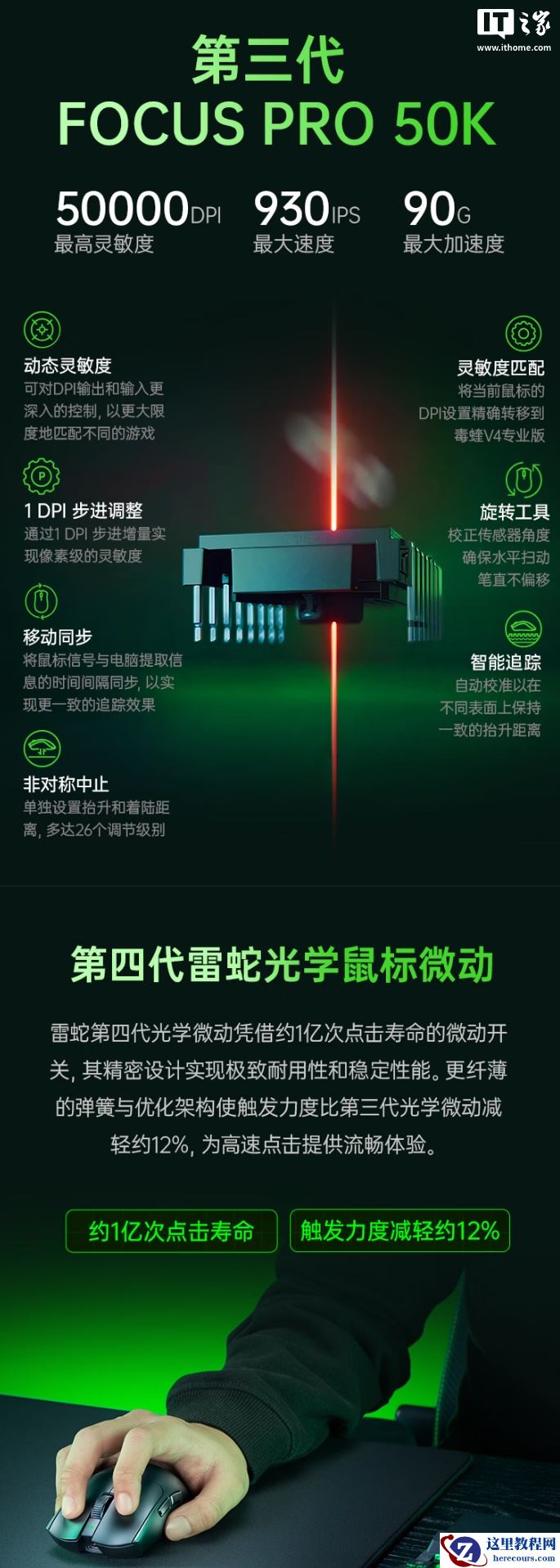 参数方面,这款鼠标搭载第三代 FOCUS PRO 50K 传感器,最高灵敏度 50000 DPI,最大速度 930 IPS,具备智能追踪、1 DPI 步进调整、移动同步、动态灵敏度等特性,配备第四代雷蛇光学微动,点击寿命可达亿次,触发力度减轻 12%。