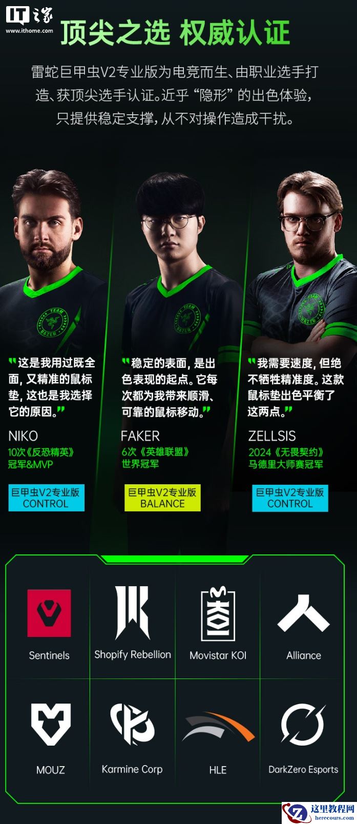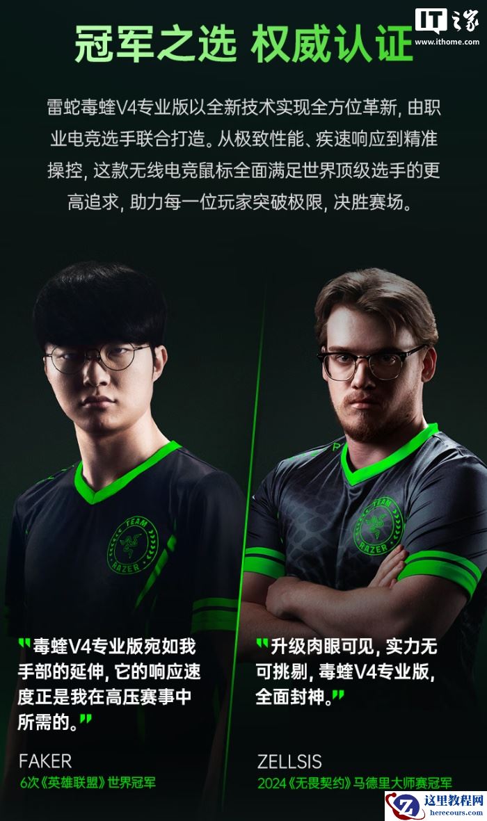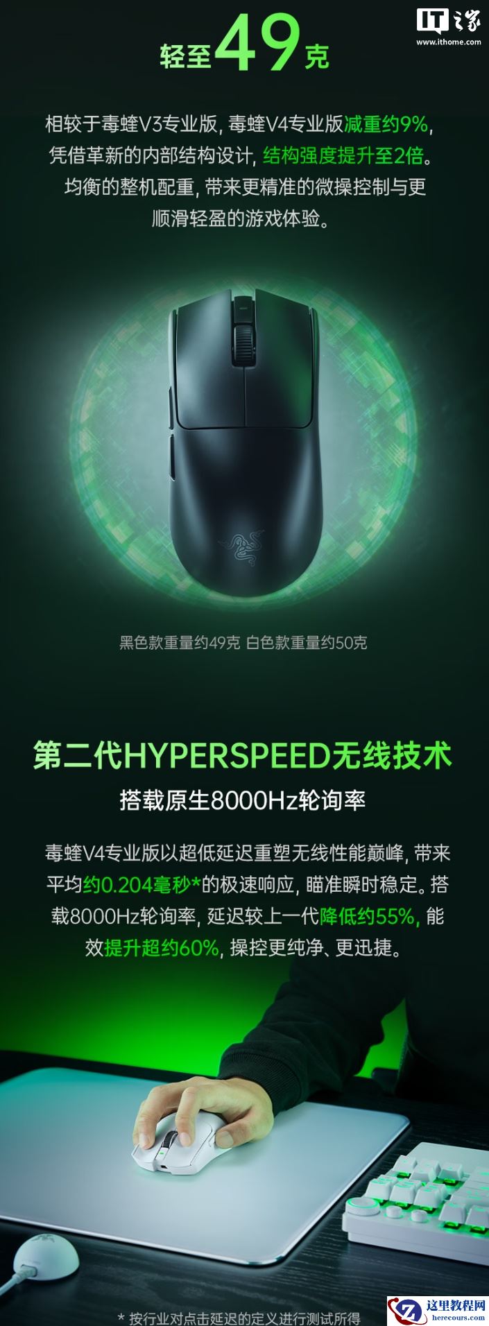 这款鼠标由 FAKER(李相赫)、ZELLSIS(乔丹 · 蒙特穆罗)等职业电竞选手联合打造,重量 49g,相比上代产品 V3 专业版减重 9%,结构强度提升 2 倍,配备第二代 HYPERSPEED 无线技术,响应时间平均 0.204 毫秒,轮询率可达 8000Hz,延迟相比上代降低 55%,能效提升超 60%。