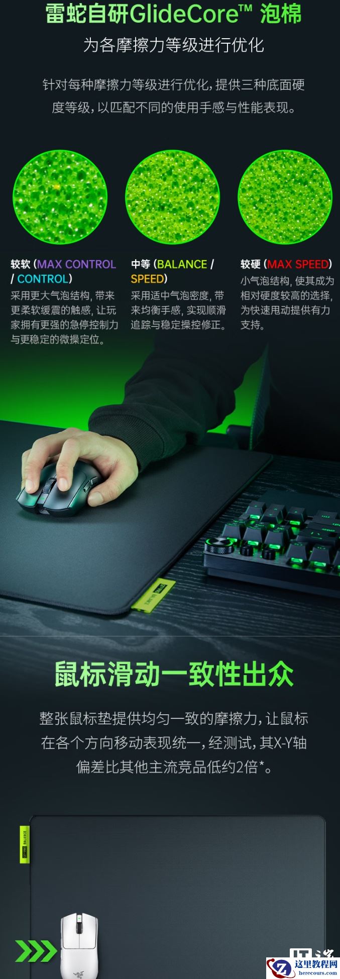 设计方面,这款鼠标垫采用专属特制丝线与编织工艺打造,内置雷蛇自研 GLideCore 泡棉,为各种摩擦力等级进行优化,提供三种底面硬度等级,整张鼠标垫均提供一致摩擦力,让鼠标在各个方向移动表现均一。