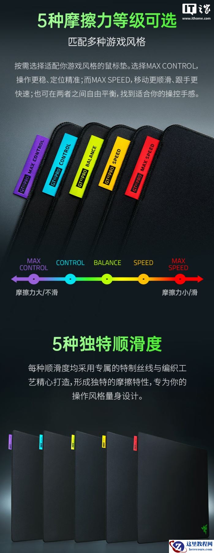这款鼠标垫专为电竞而生,由职业选手打造,可选 5 种摩擦力,例如需要顺滑快速移动的玩家可以选 MAX SPEED;需要精准定位操作的可以选 MAX CONTROL。