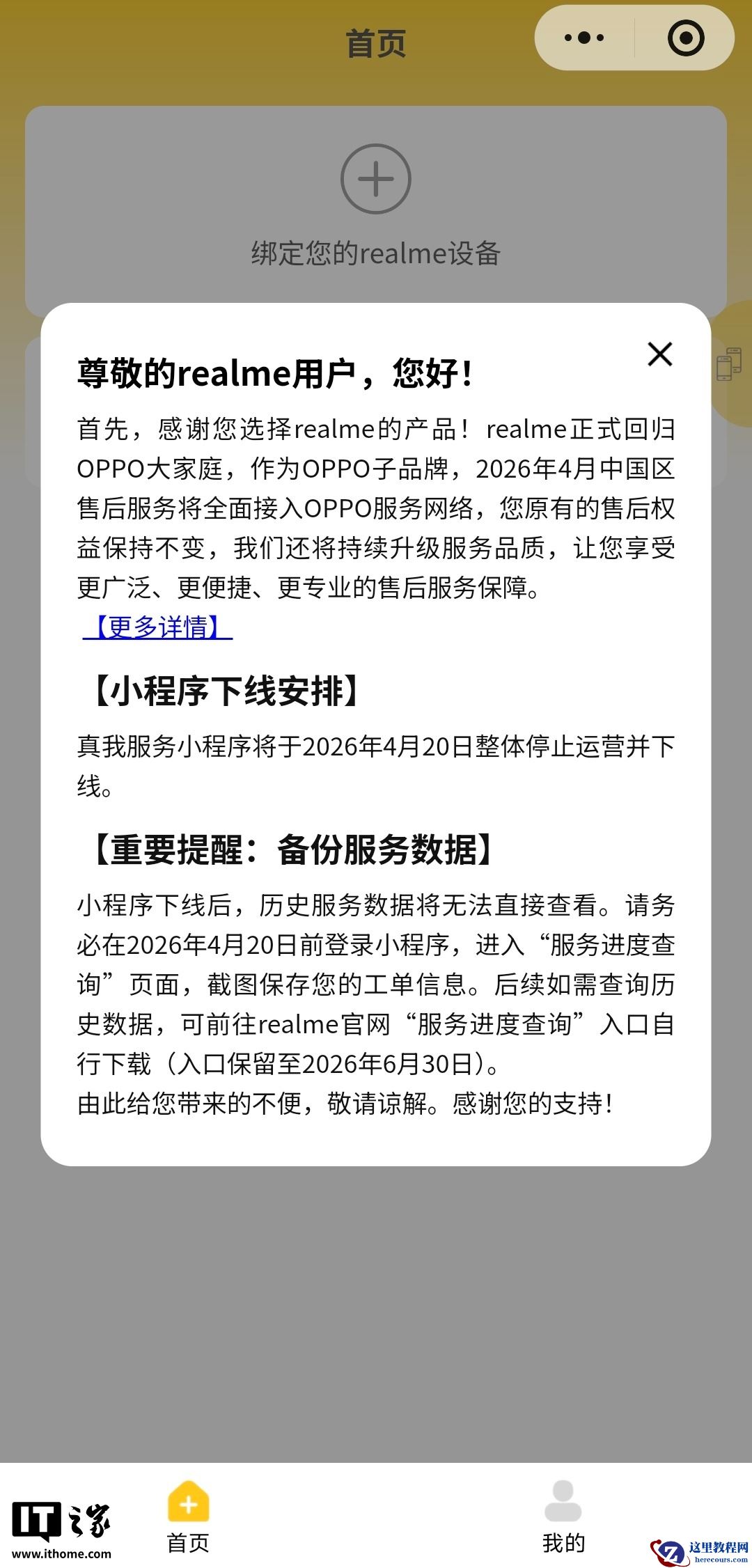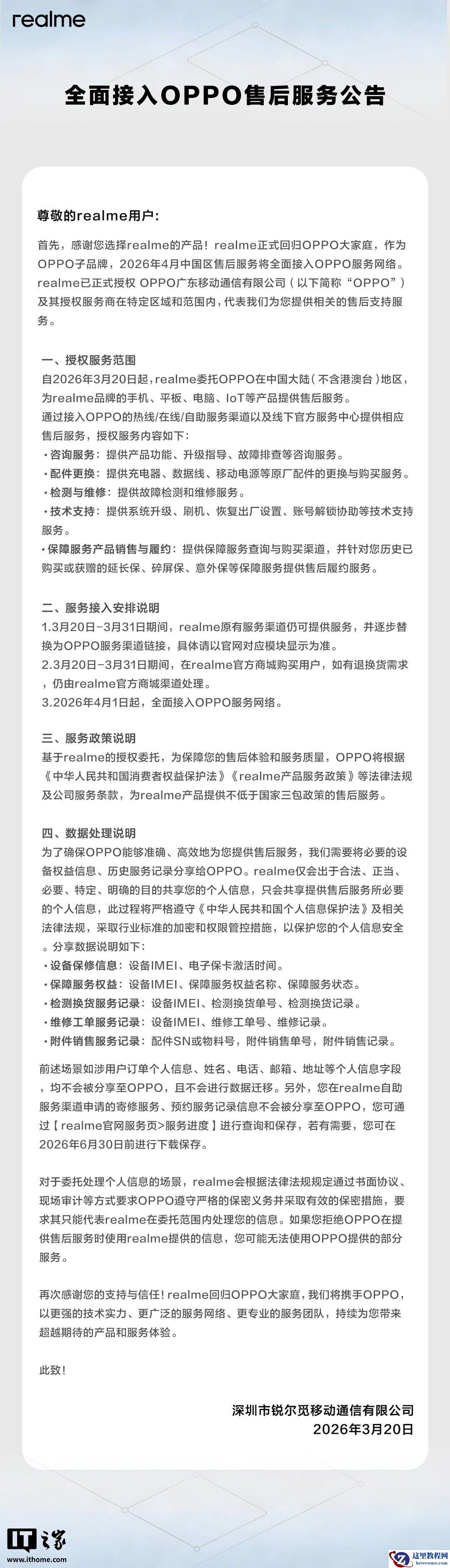 此前报道,真我官方在 3 月 20 日发布公告,宣布其在中国大陆地区的售后服务将逐步整合至 OPPO 服务体系。自 2026 年 4 月 1 日起,realme 在中国大陆(不含港澳台)的手机、平板、电脑及 IoT 等产品将全面由 OPPO 服务网络提供售后服务。