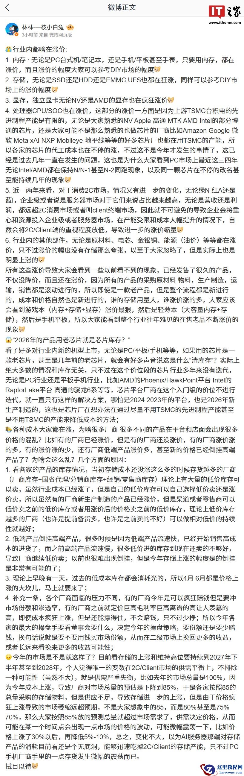 3 月 26 日消息,荣耀中国区智慧生活业务部部长林林今日发文感叹,称行业内的原料几乎在涨价,包括内存、存储、显存、处理器 CPU / SOC 等。