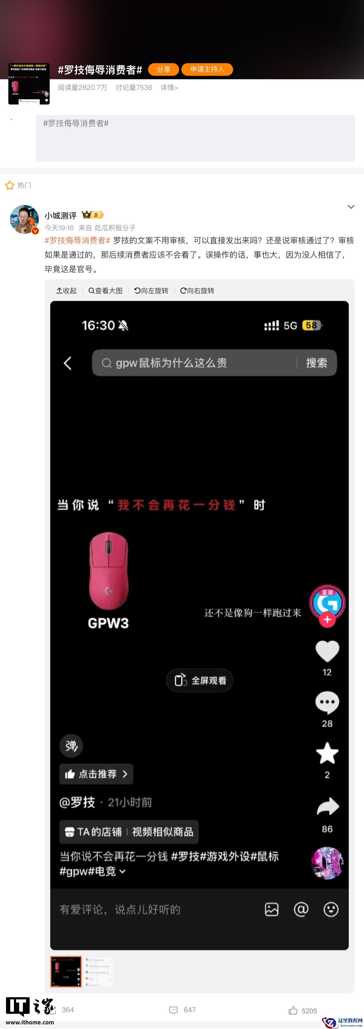 3 月 26 日消息,3 月 26 日,罗技官方账号通过短视频平台发布鼠标宣传推广视频,配文出现“我一降价,还不是像狗一样跑过来”的文案,引发众怒,“罗技侮辱消费者”有关话题一度于今晚 21 时 11 分登顶微博热搜。截至发文,该话题目前位居热搜榜单第五。