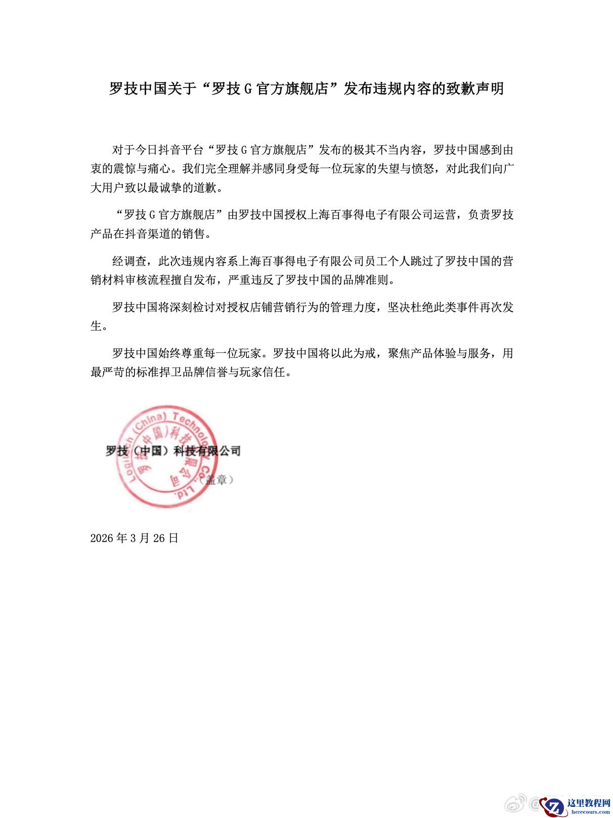 3 月 26 日消息,今天晚间,罗技中国官微发布《罗技中国关于“罗技 G 官方旗舰店”发布违规内容的致歉声明》。